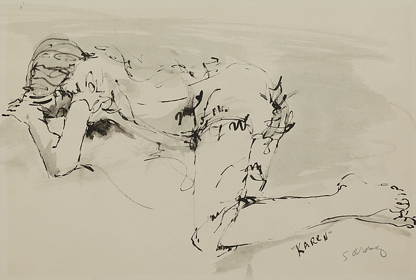 A sketch of a reclining figure features expressive lines and shading that convey a sense of relaxed posture. Signed by the artist, the drawing... more